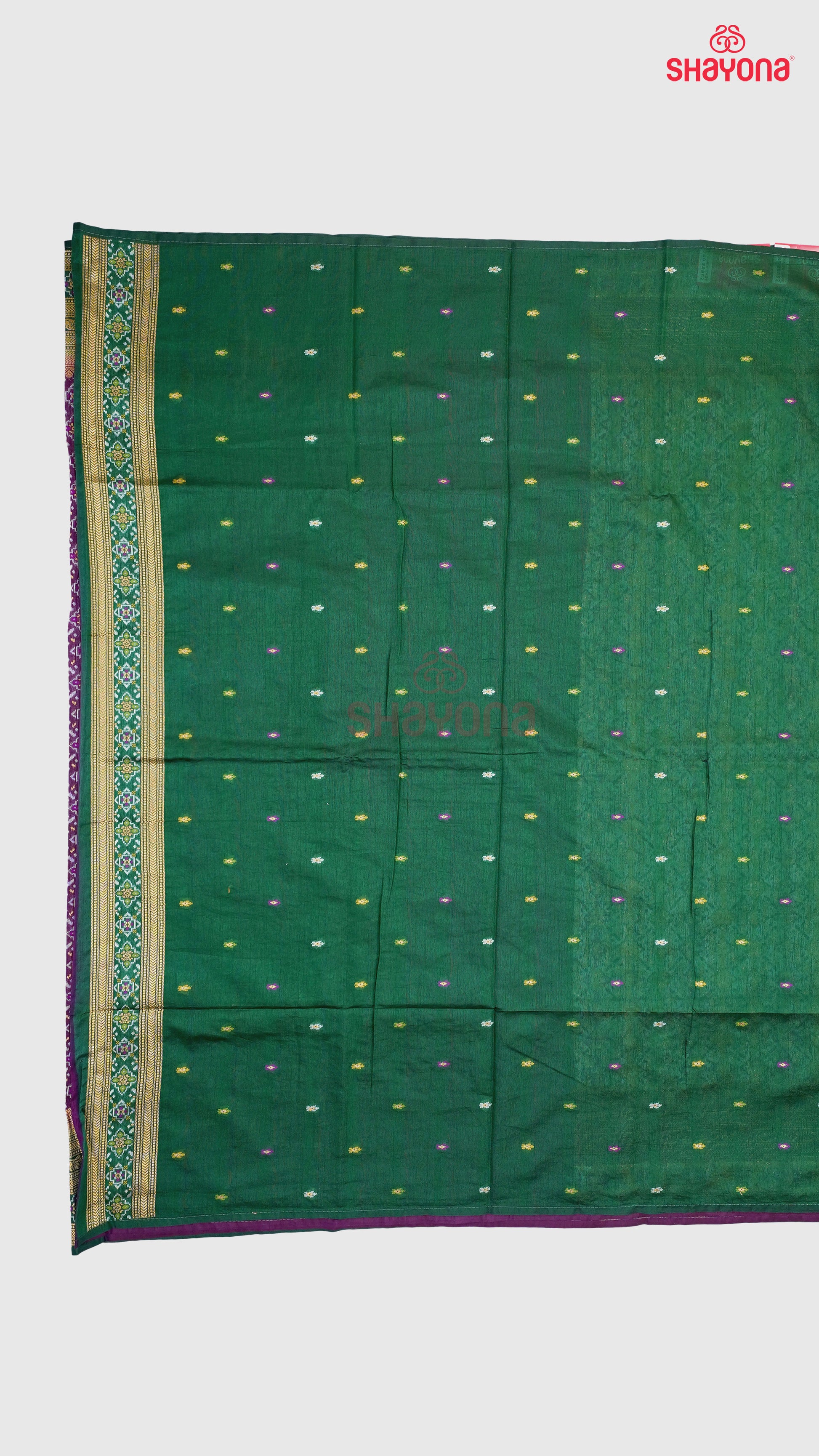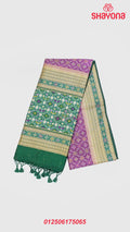 Woven with finesse, this saree measures 5.50 meters and comes with a matching 0.80-meter blouse piece in complementary weave. The deep richness of Dark Purple merges flawlessly with the earthy Pomona Green, creating a regal palette perfect for festive gatherings, traditional ceremonies, or cultural events.