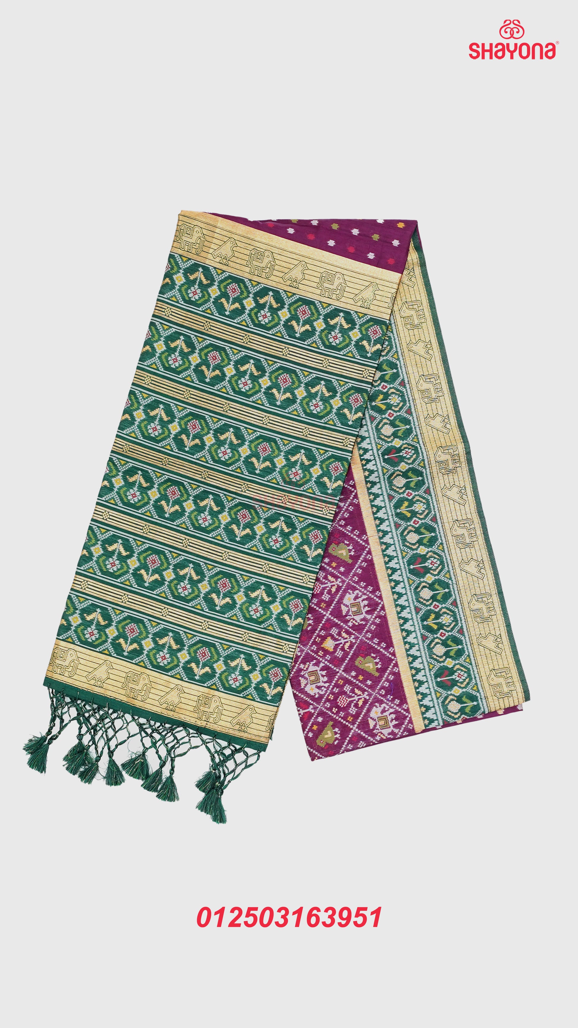The luxurious blend of deep dark purple and earthy Pomona green creates a striking dual-tone contrast, making it a standout for festive occasions, cultural events, and wedding celebrations. Paired with a 0.80-meter matching weaved blouse piece, this saree effortlessly balances grace and grandeur.
