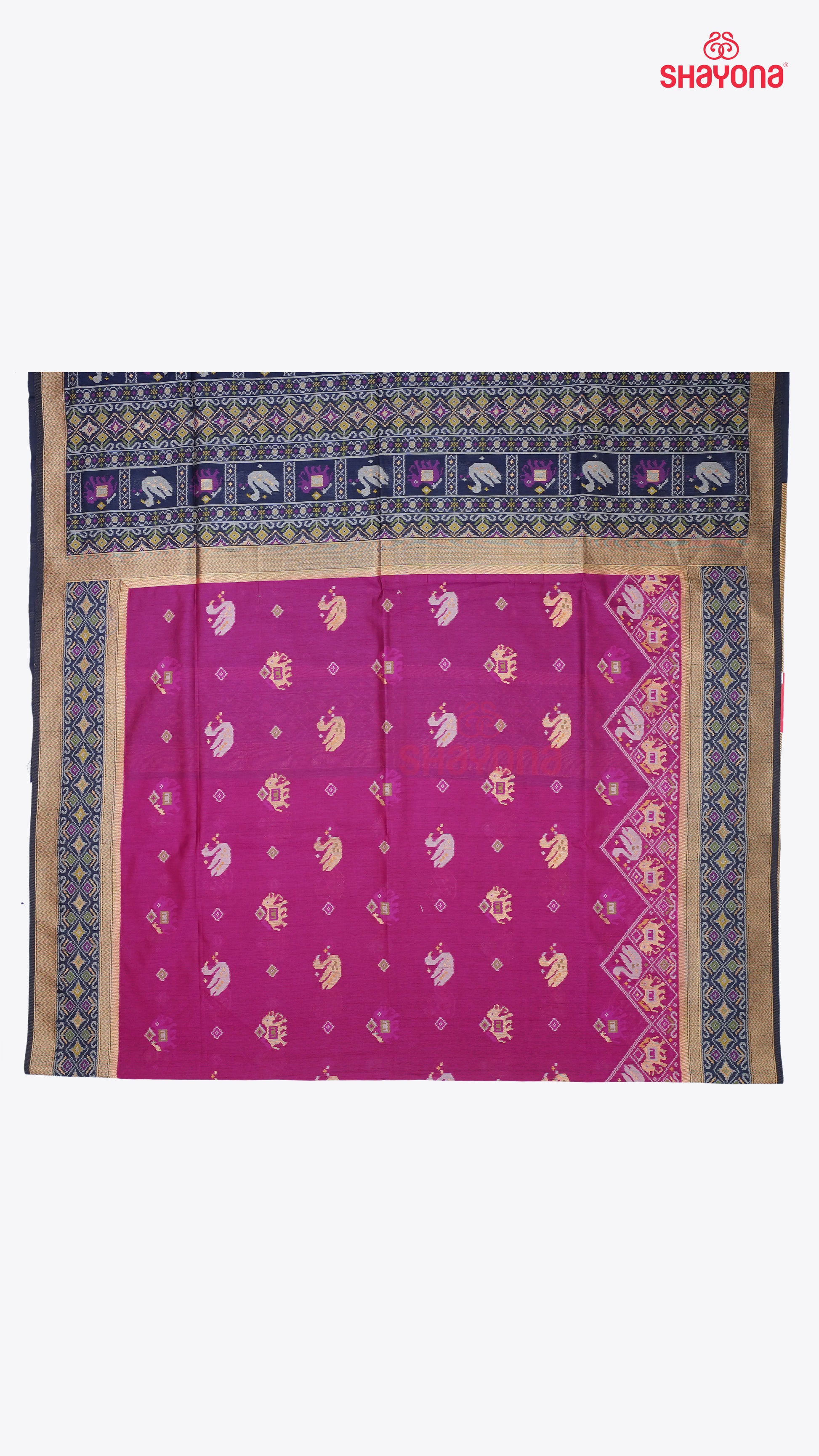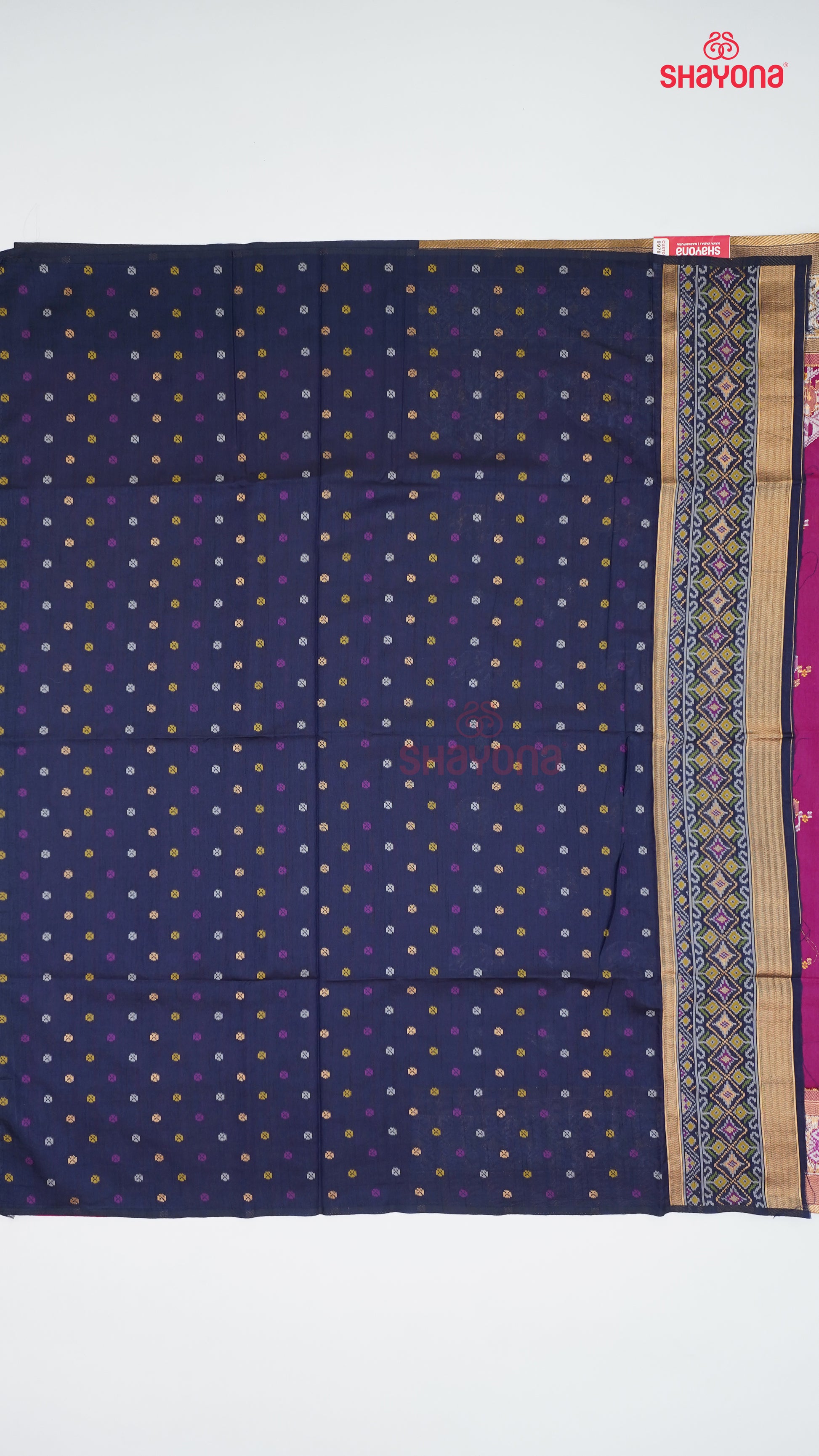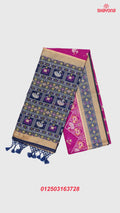 With a rich contrast between intense violet-red tones and deep navy blue, this 5.50-meter saree makes a powerful style statement for festive occasions, cultural functions, and elegant evenings. Includes a matching 0.80-meter weaved blouse piece to complete the ensemble.