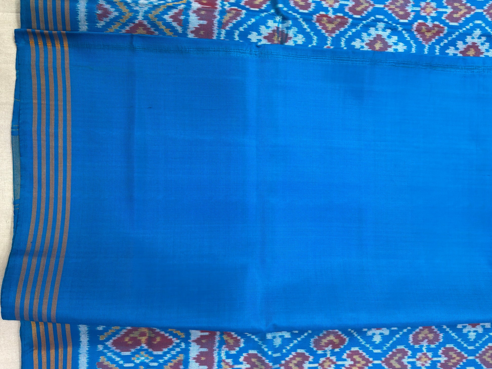 The Pure Silk Jada Na Patola is crafted using a meticulous and time-honored weaving technique rooted in traditional Indian handloom artistry. Pure silk yarns are carefully dyed before weaving to ensure vibrant, long-lasting colors and precise motif alignment.