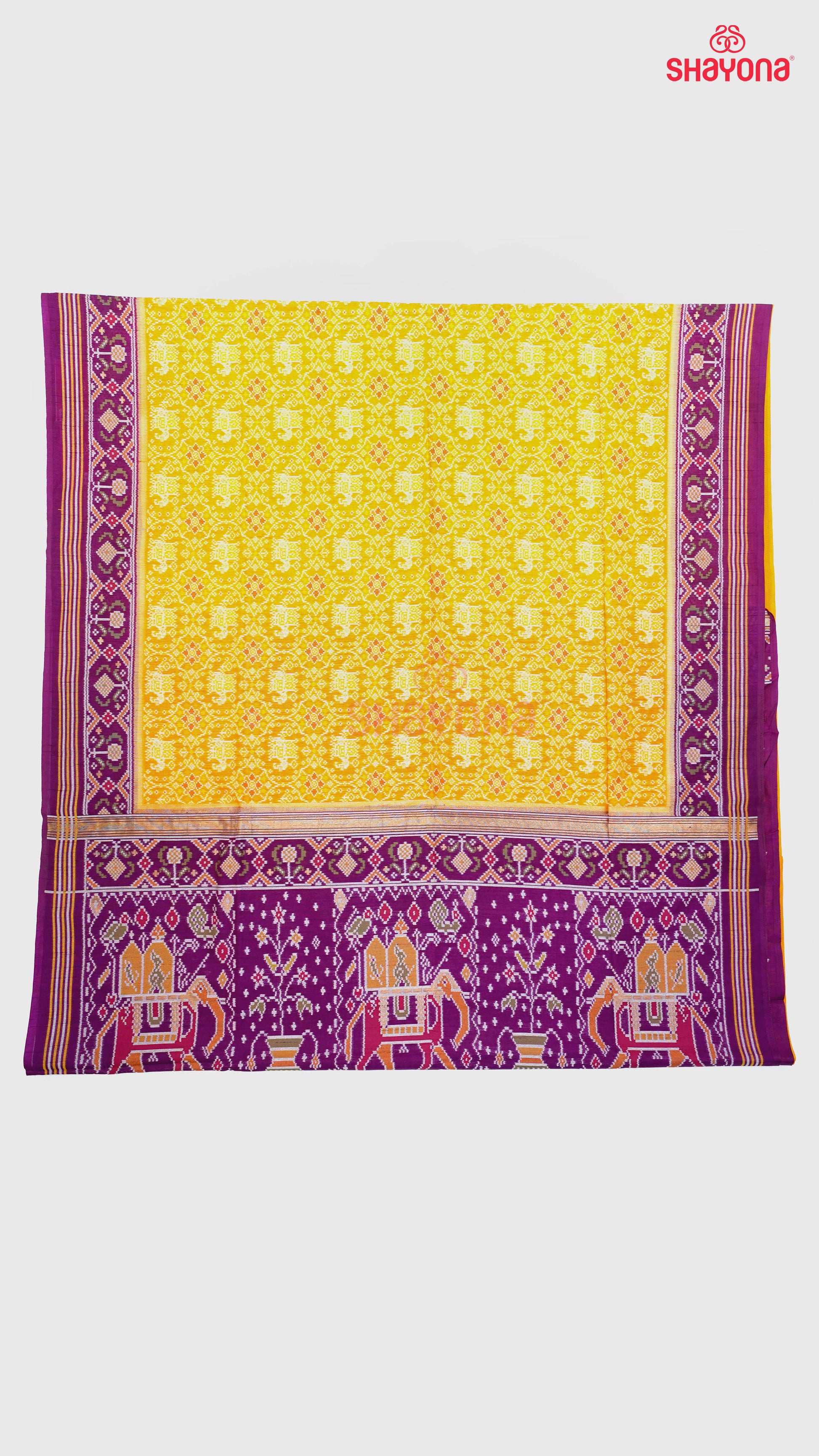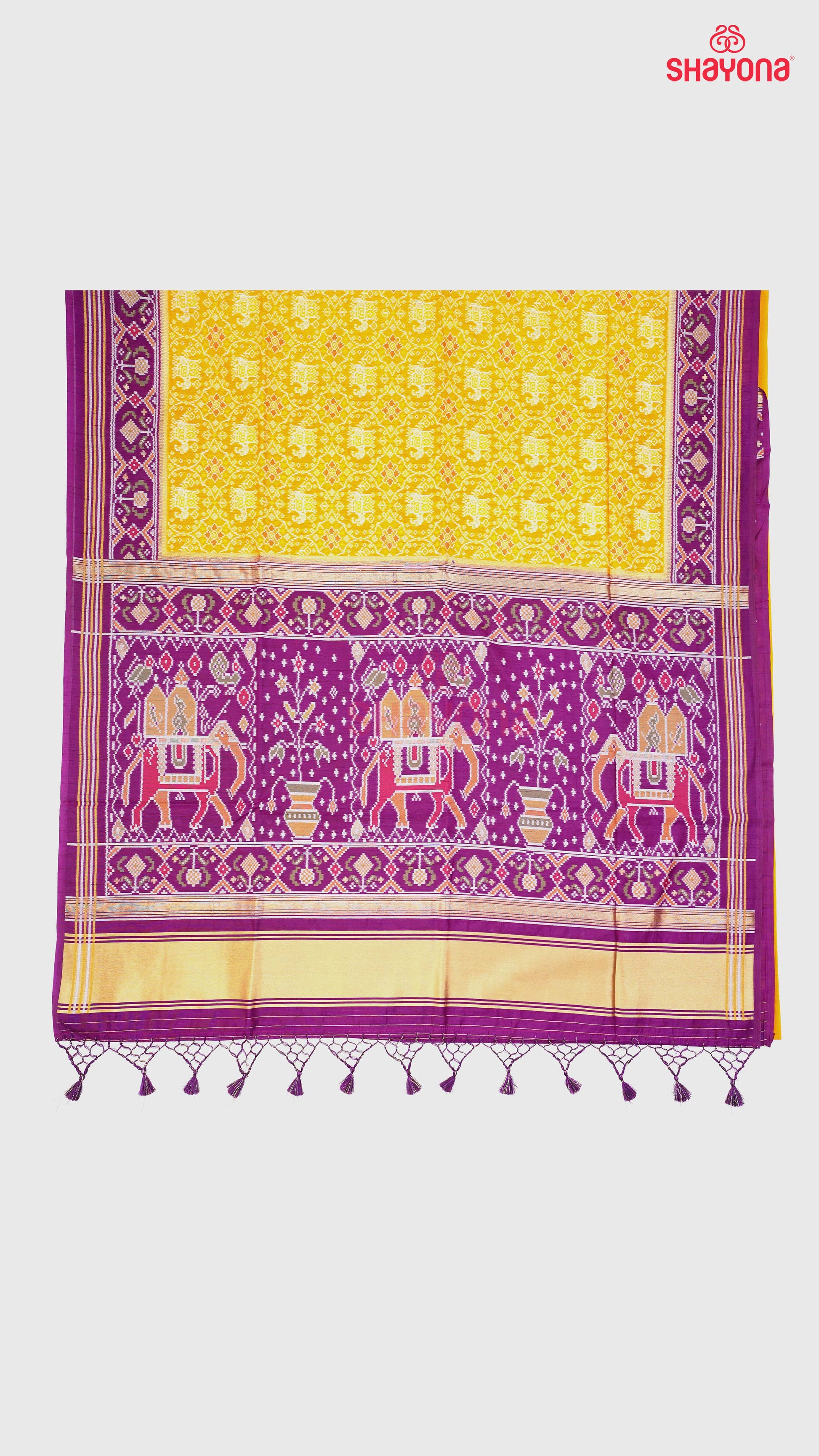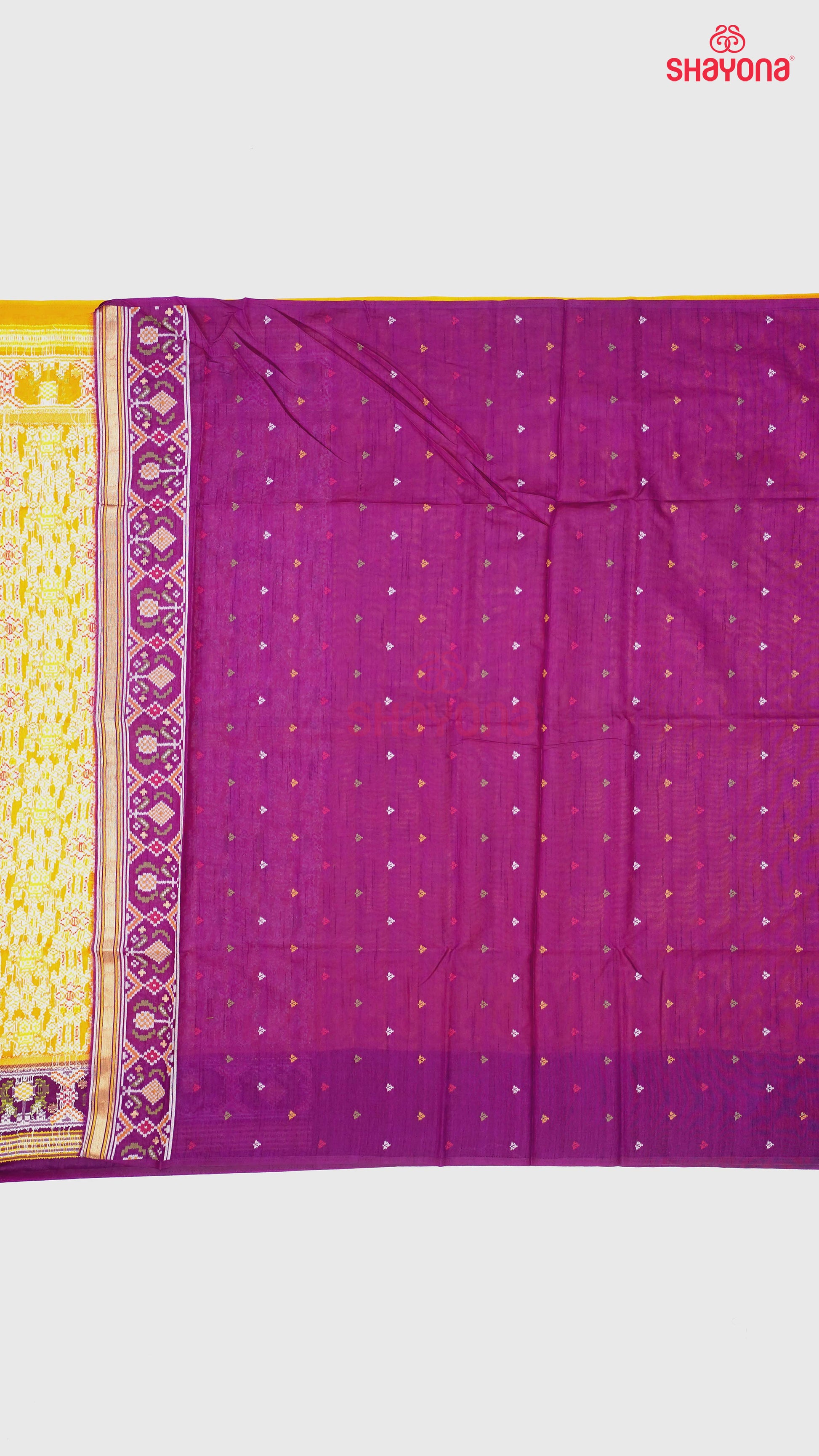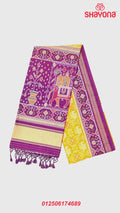 The vibrant mustard base paired with deep dark purple accents makes this drape an eye-catching and luxurious ensemble.