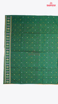 Its highlight feature is the intricately designed skirt-style nakshi border and a complementing ornate pallav, which add a regal finish to the drape. The vibrant mustard body blends harmoniously with the refreshing Pomona green border, creating a statement-worthy color contrast. Paired with a 0.80-meter weaved border blouse, it’s perfect for festive gatherings, traditional ceremonies, or graceful daywear.