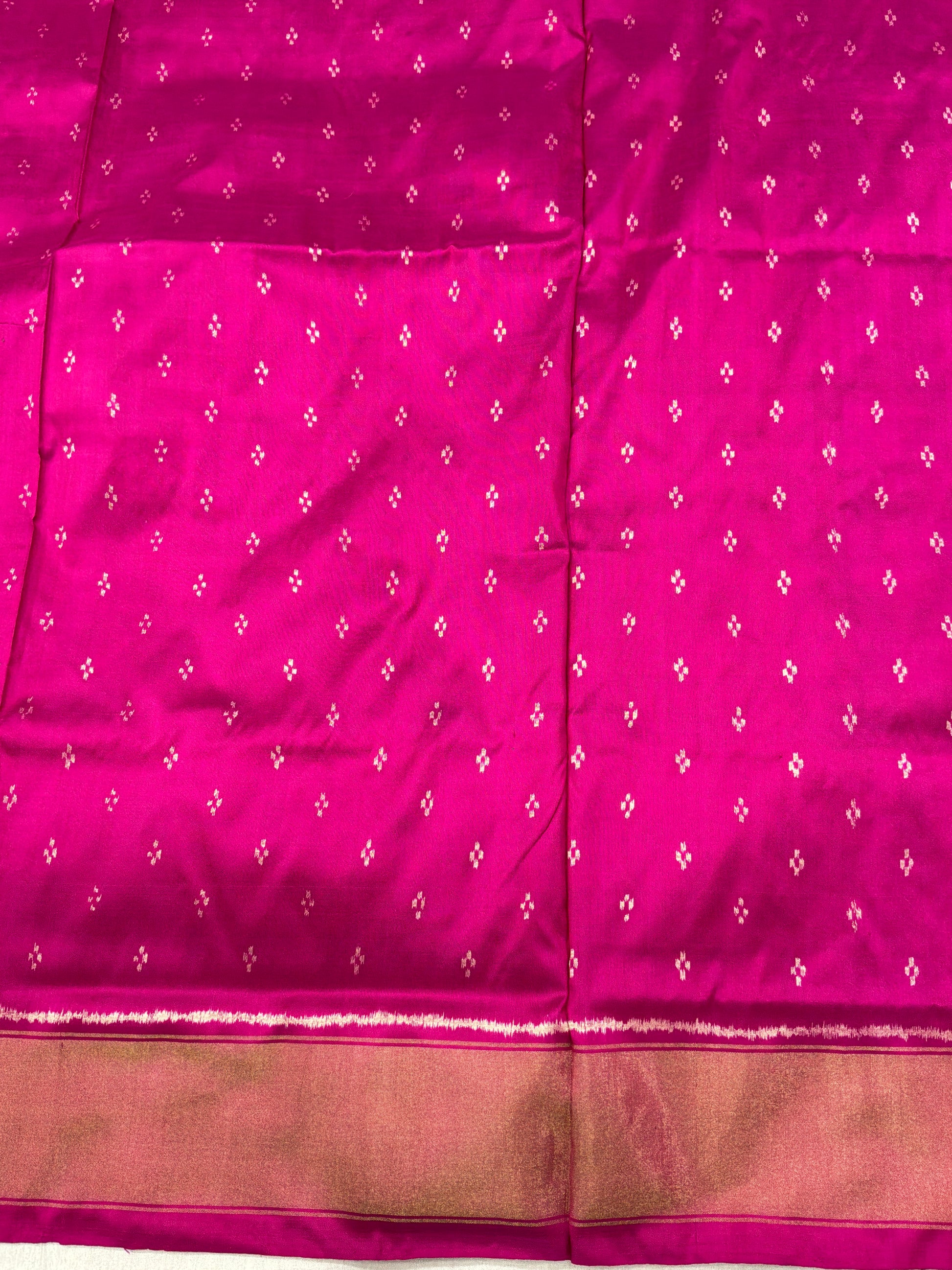 The Pure Silk Hyderabadi Patola is crafted using a highly skilled traditional weaving technique inspired by centuries-old Patola artistry. Silk yarns are carefully dyed before weaving to achieve precision in patterns and vibrant color symmetry. Expert artisans weave the saree on traditional looms, ensuring that the motifs appear perfectly aligned and rich on both sides of the fabric.