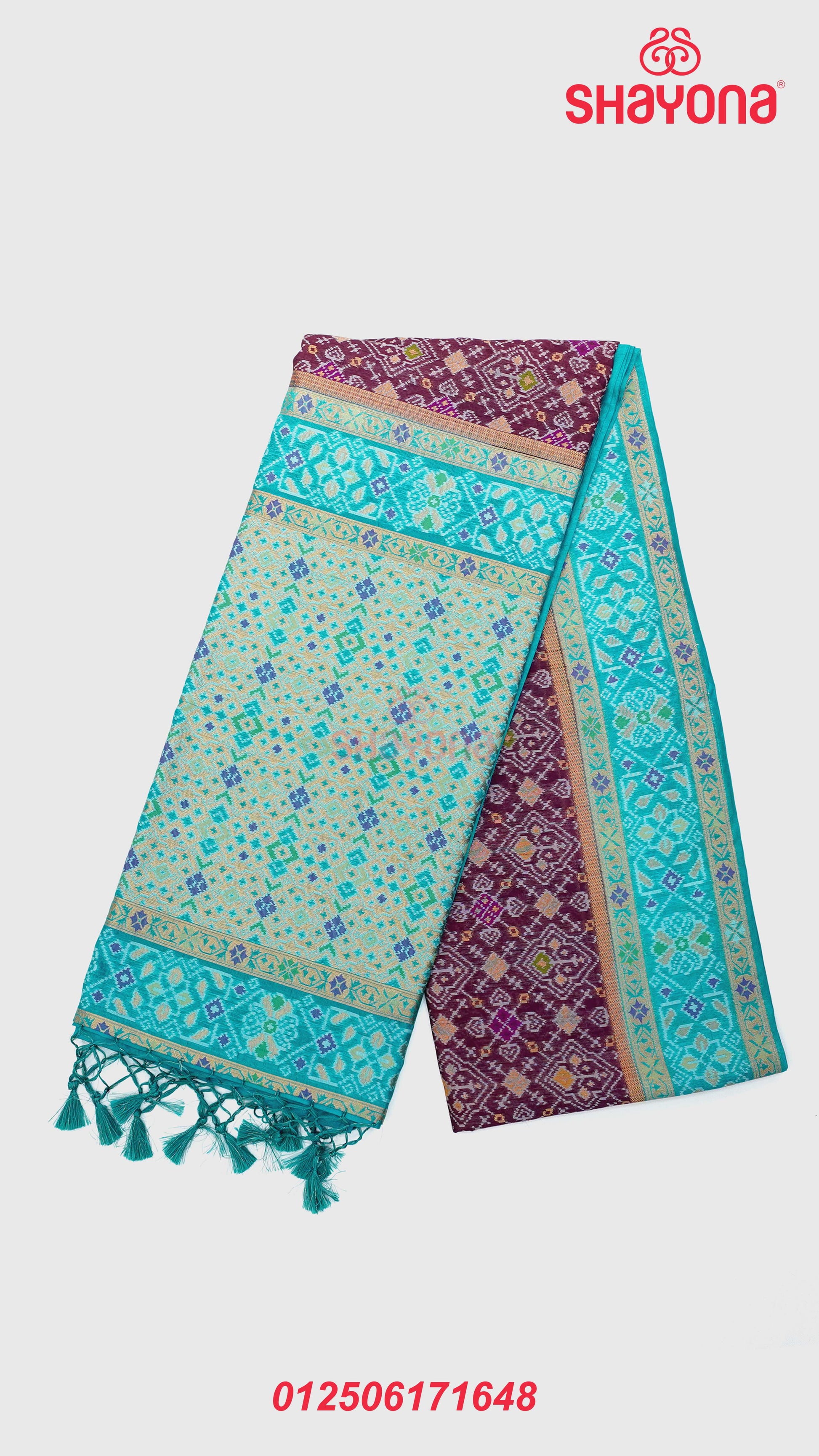 A finely crafted nakshi border elevates the classic charm, while the minakari pallav brings a touch of grandeur and celebration to the drape. The powerful pairing of deep wine and cadet blue tones adds a dramatic, luxurious appeal, perfect for festive gatherings, cultural events, or weddings.