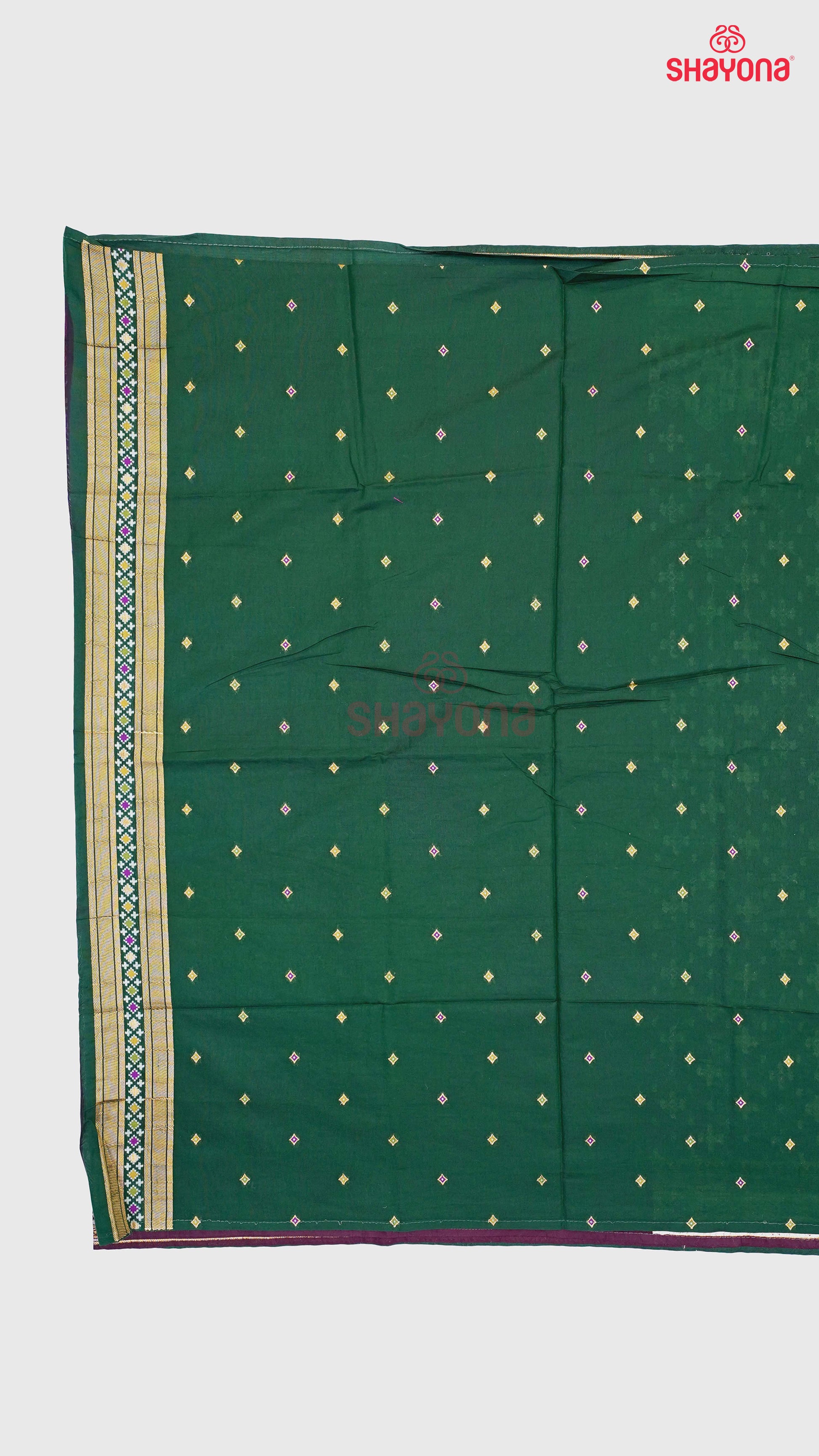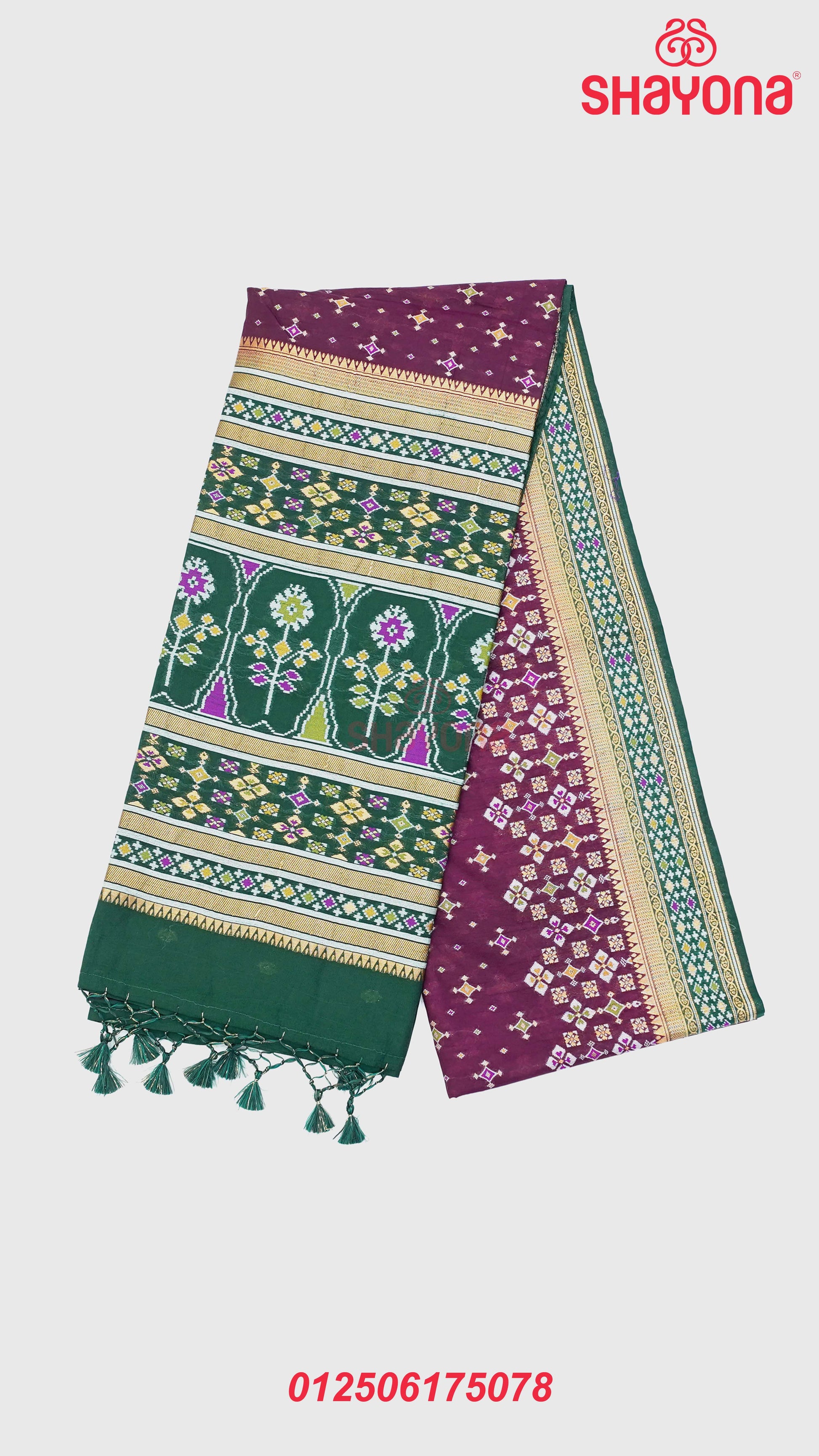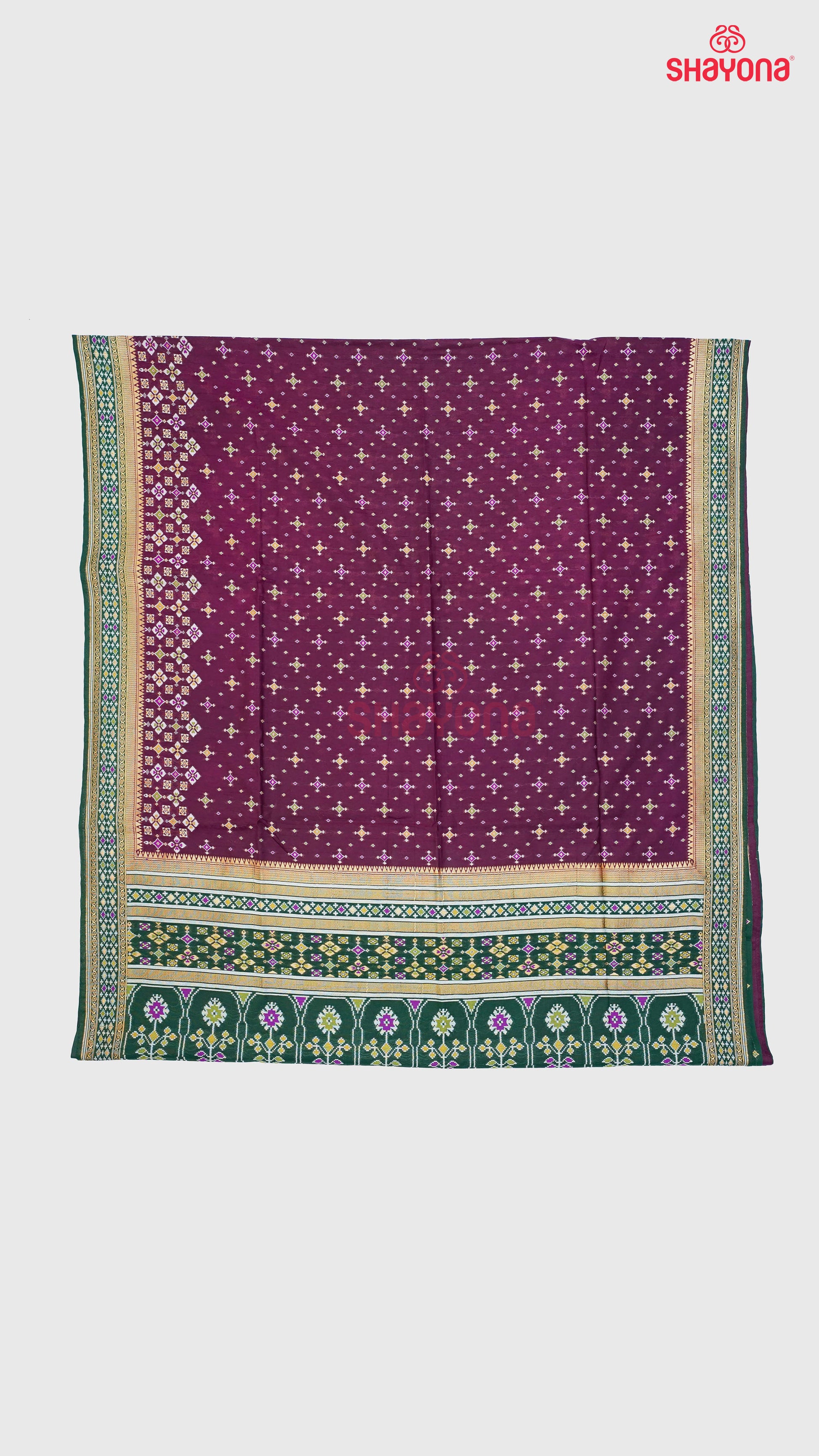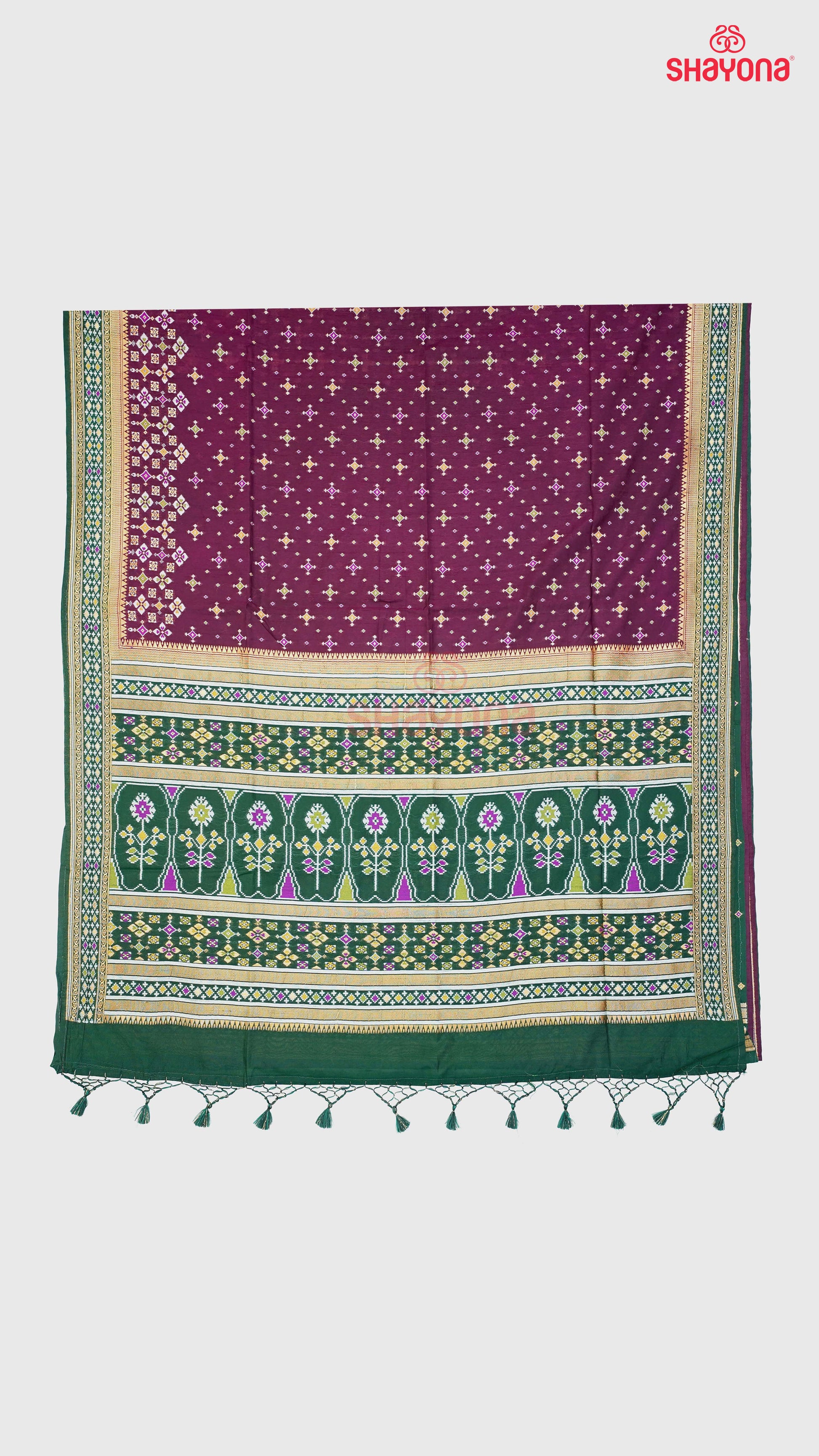 “Wine & Pomona Green Ghicha Silk Saree – Woven Luxury with a Regal Aura”