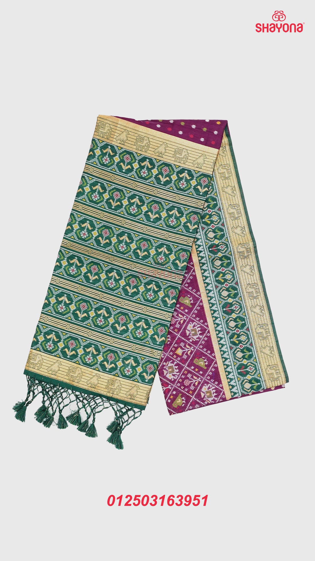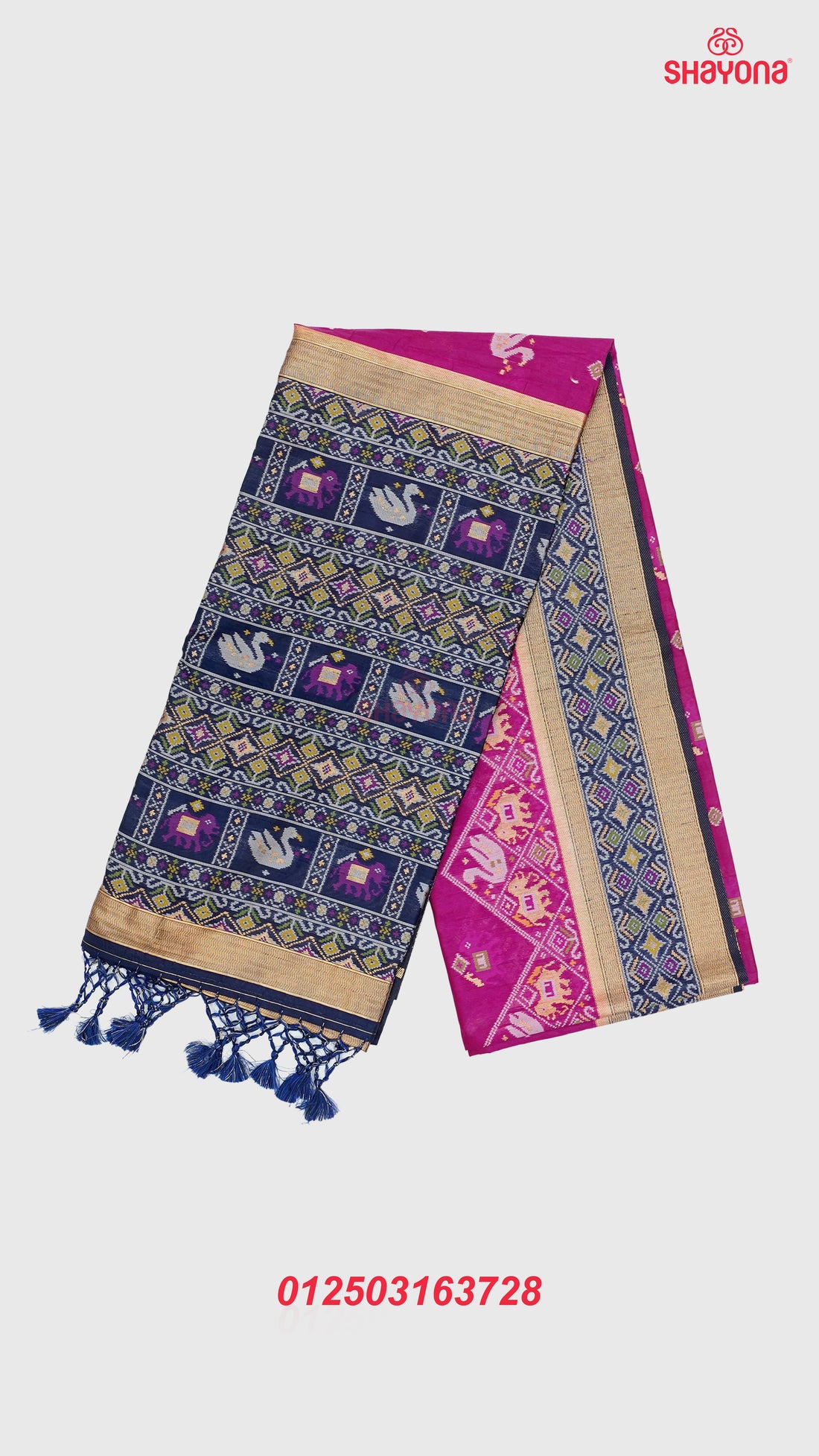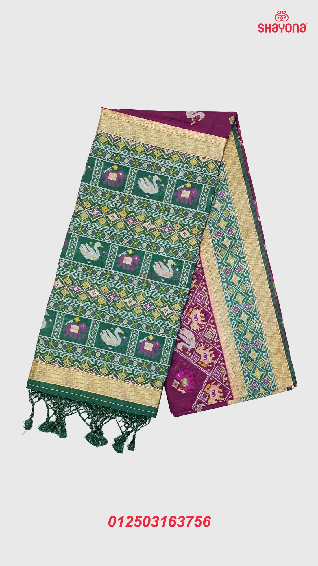 Patola is a traditional, intricate, and exquisite saree originating from Patan, Gujarat, India. It's renowned for its vibrant colors, unique patterns, and labor-intensive manufacturing process.It is woven using a double ikat method, where both the warp and weft threads are tie-dyed before weaving. Traditional Patola sarees use natural dyes, such as vegetable and plant extracts.Patola sarees feature complex geometric patterns, floral motifs, and animal designs. This sarees are draped on occassion of Weddings, Festivals (e.g., Navratri, Diwali), Traditional events and Formal gatherings.