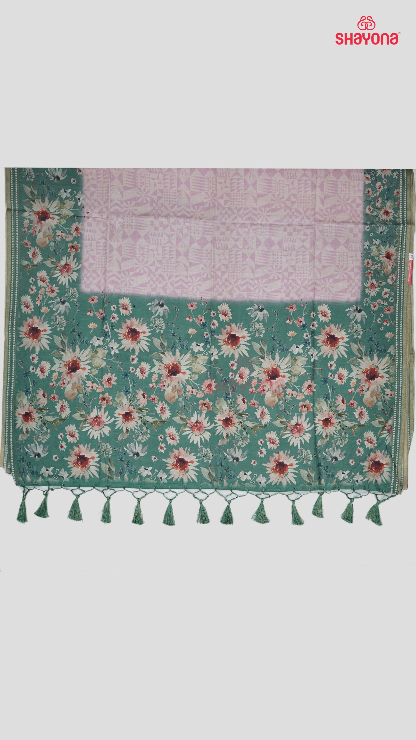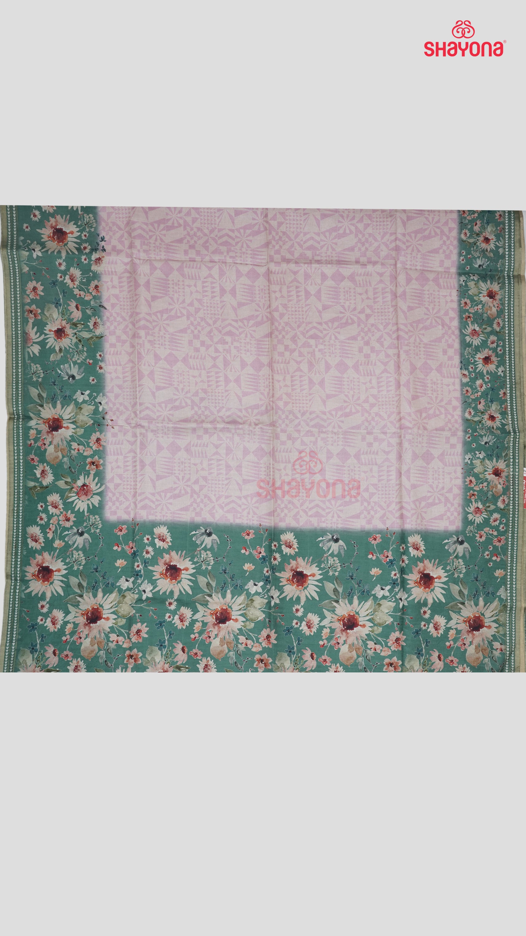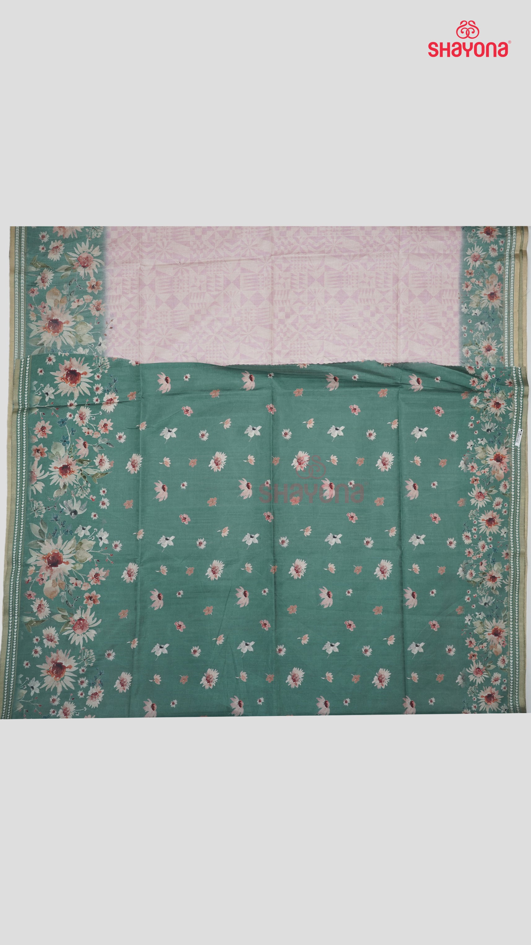 Step into elegance with this sea green & pink coloured weaved Tussa based cotton saree (5.50 mts), designed with a perfect blend of tradition and contemporary charm. The saree features a digital printed jaal spread gracefully all over the almond-coloured gala, while the pink pallav & border are beautifully highlighted with multicoloured floral butta jaal, giving it a festive grandeur.