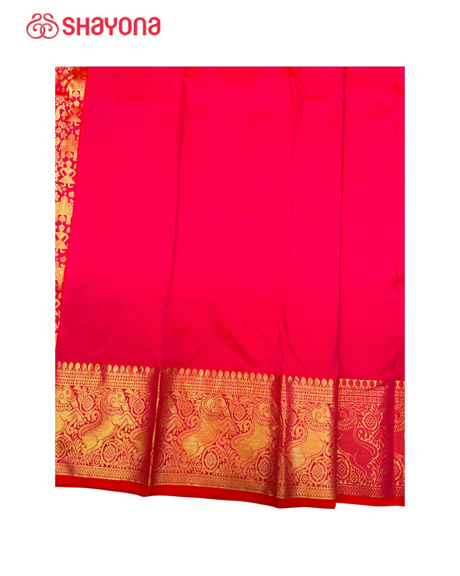 Traditional motifs inspired by temples, coins, florals, and geometric patterns reflect South India’s royal and spiritual legacy. Each saree takes several days to weeks to complete, making it a true masterpiece of Indian handloom artistry.