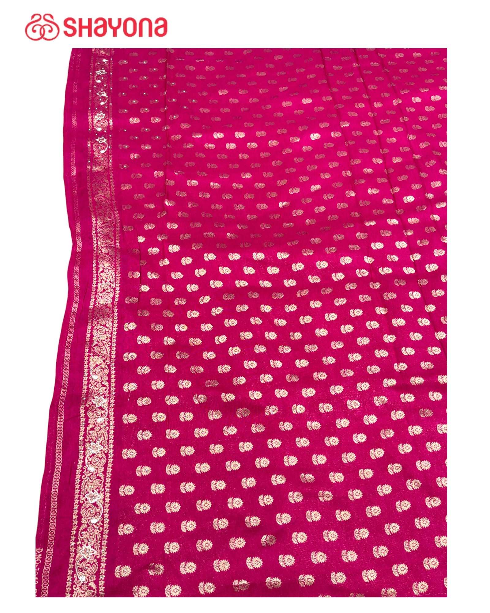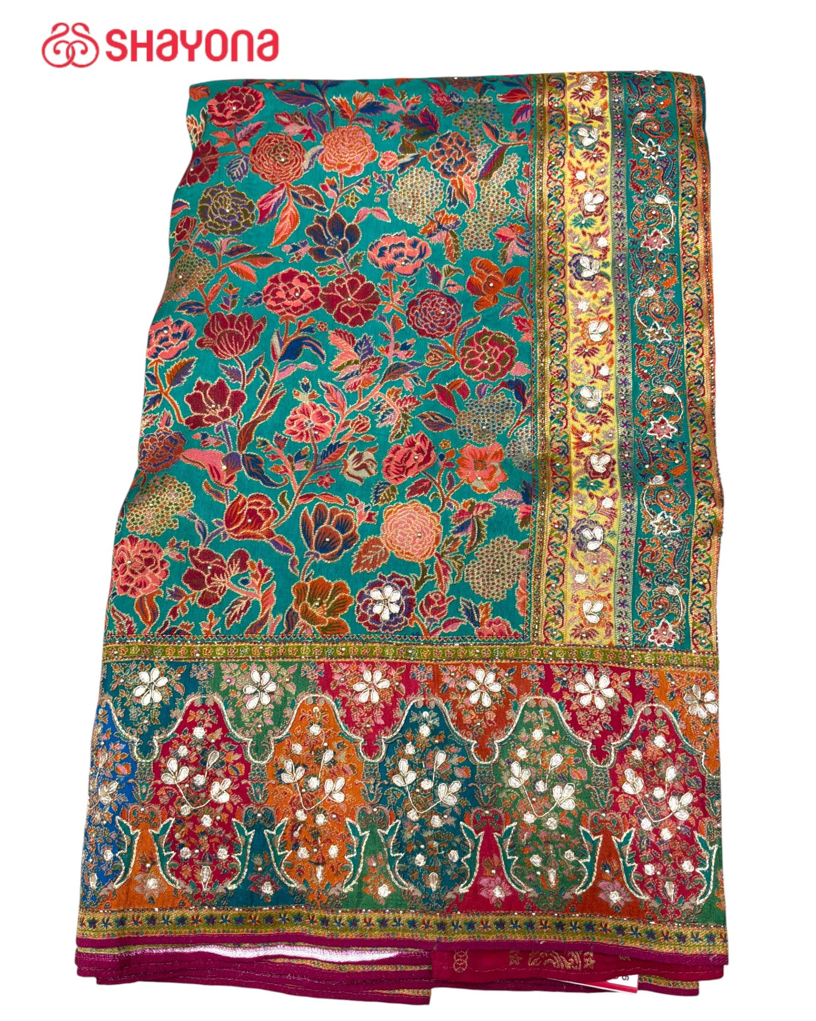 A masterpiece of elegance and heritage, this Tissue Pashmina Silk Saree with Handwork blends luxurious silk with delicate pashmina texture, adorned with intricate hand embroidery that reflects timeless Indian craftsmanship.