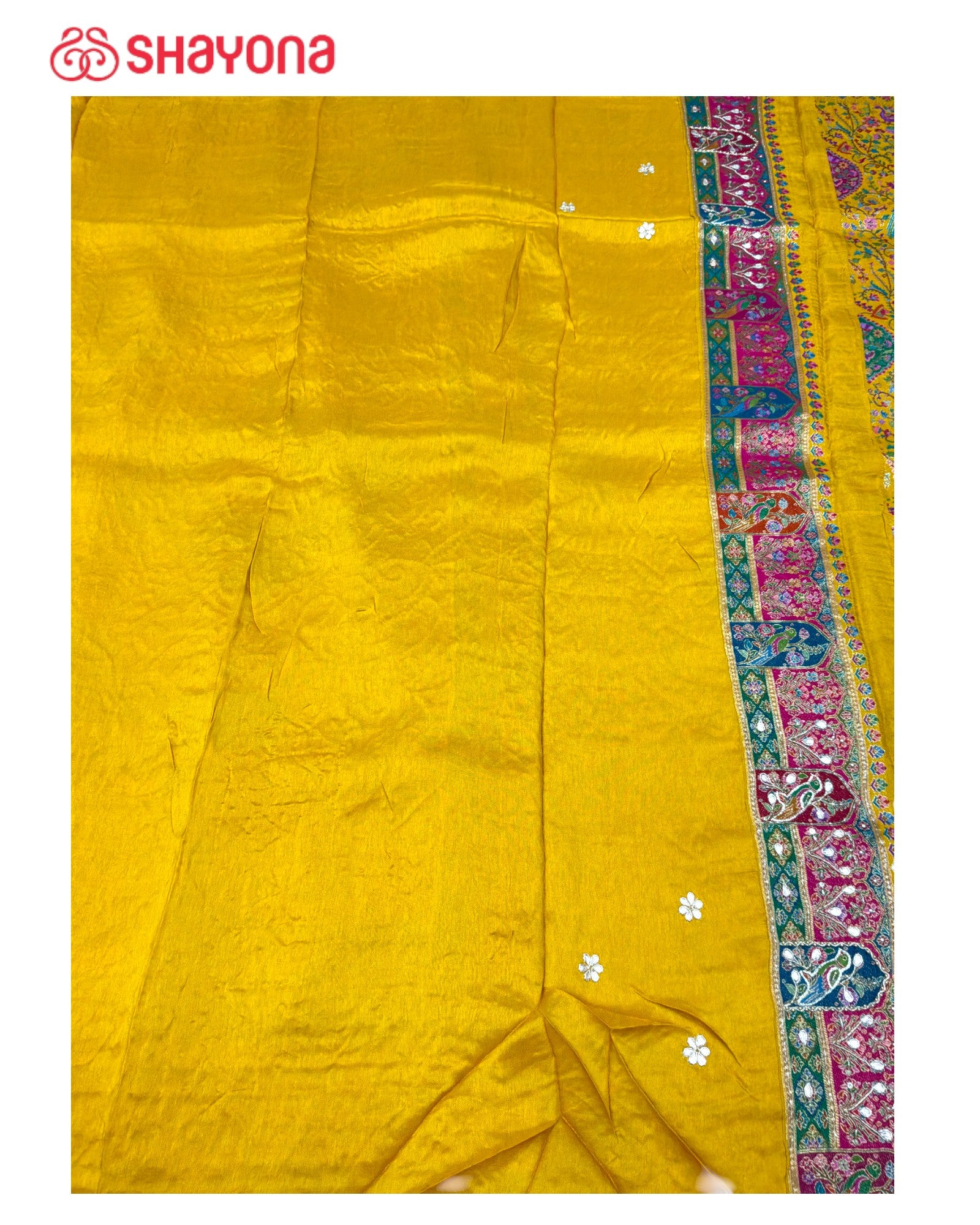 A masterpiece of elegance and heritage, this Tissue Pashmina Silk Saree with Handwork blends luxurious silk with delicate pashmina texture, adorned with intricate hand embroidery that reflects timeless Indian craftsmanship.
