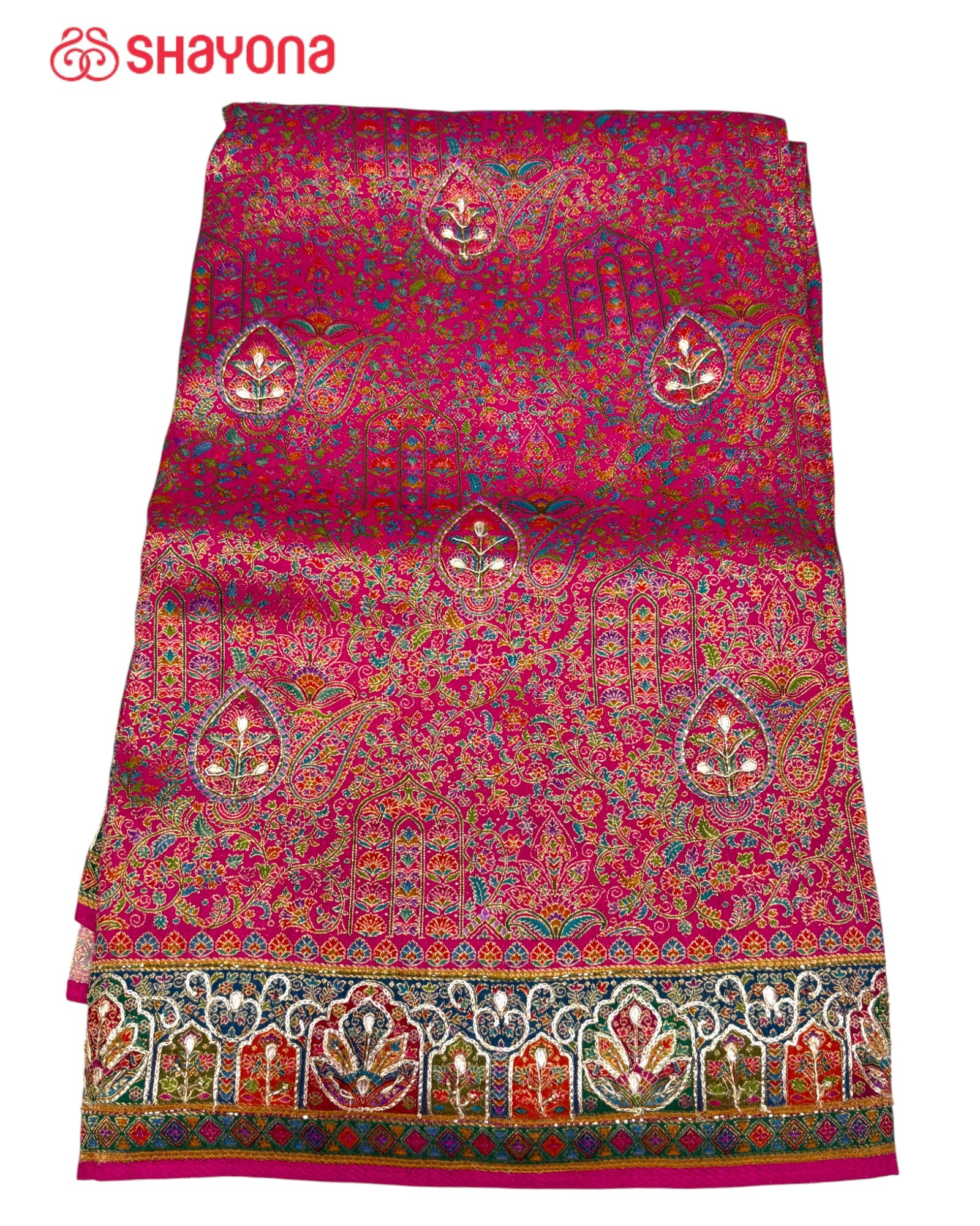 A masterpiece of elegance and heritage, this Tissue Pashmina Silk Saree with Handwork blends luxurious silk with delicate pashmina texture, adorned with intricate hand embroidery that reflects timeless Indian craftsmanship.