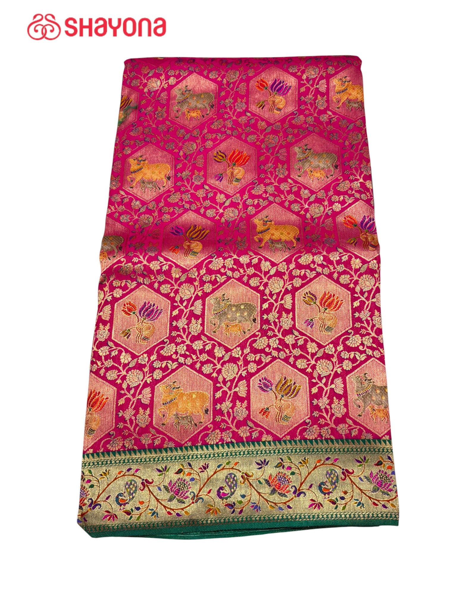 Drape yourself in timeless elegance with our Tissue Pashmina Silk Saree, featuring exquisite motifs, rich borders, and a luminous silk sheen—perfect for weddings, festive occasions, and grand celebrations.