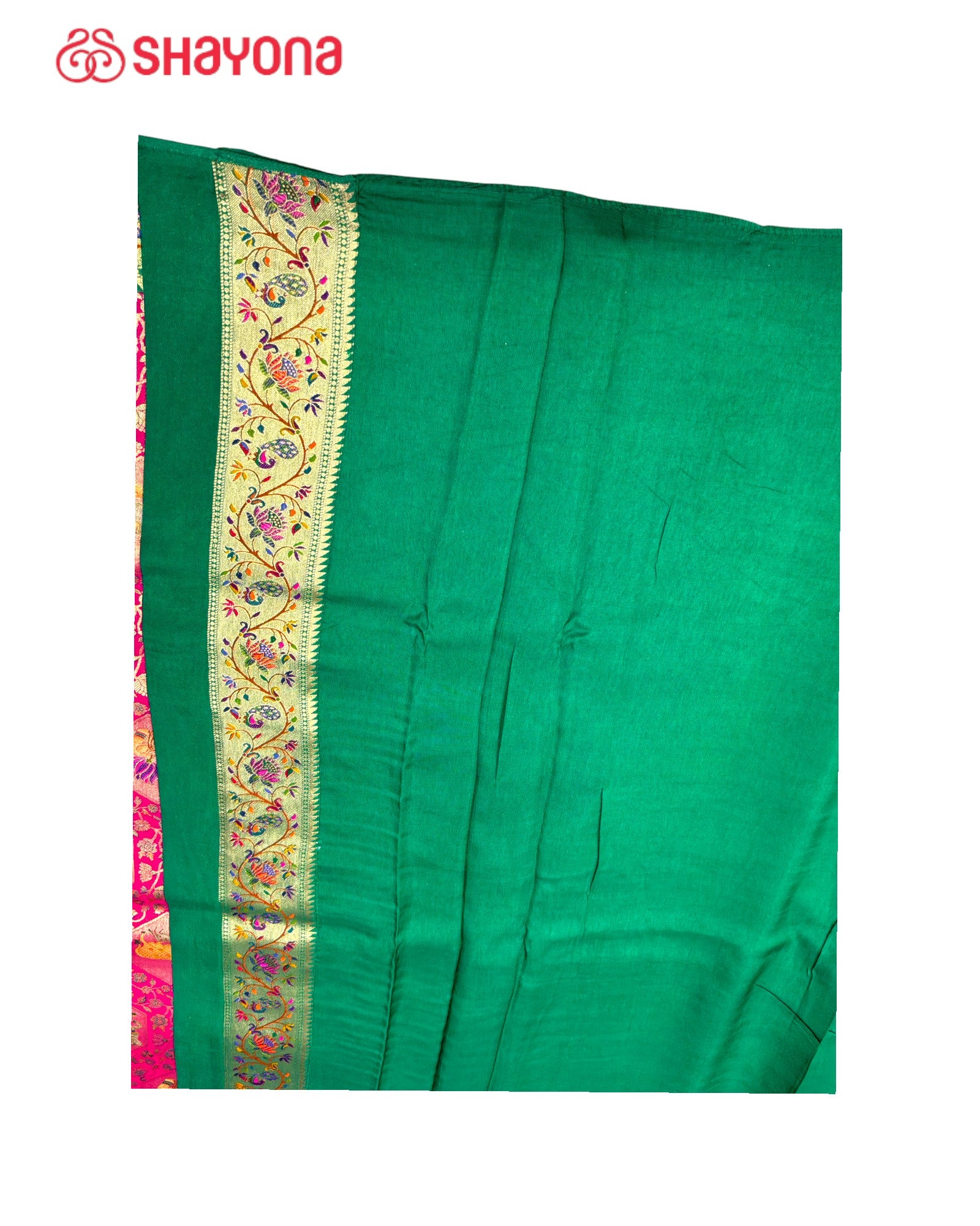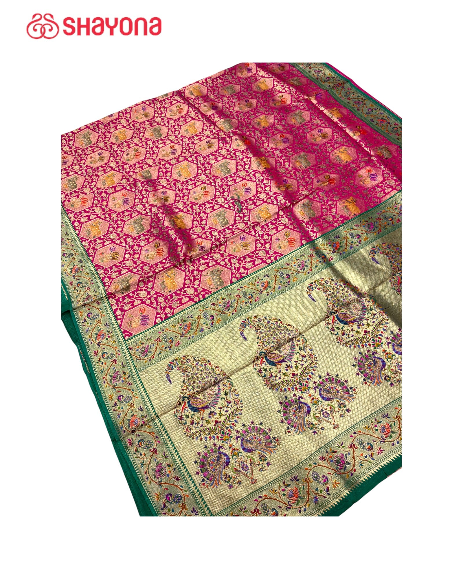 This Tissue Pashmina Silk Saree is crafted using a blend of fine silk yarns and delicate tissue weaving techniques that create its signature luminous finish. Skilled artisans weave intricate traditional motifs inspired by royal Indian heritage, temples, nature, and classical art forms.