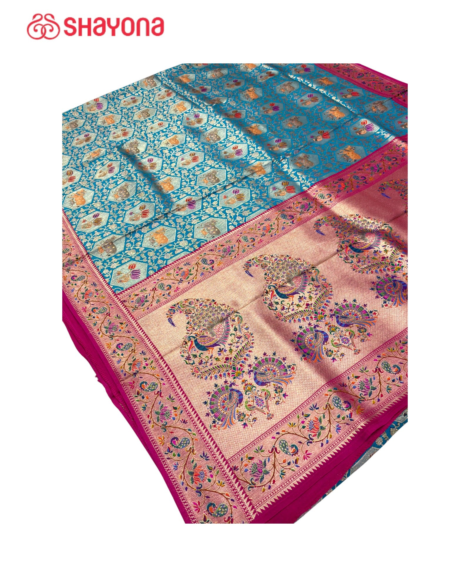 This Tissue Pashmina Silk Saree is crafted using a blend of fine silk yarns and delicate tissue weaving techniques that create its signature luminous finish. Skilled artisans weave intricate traditional motifs inspired by royal Indian heritage, temples, nature, and classical art forms.